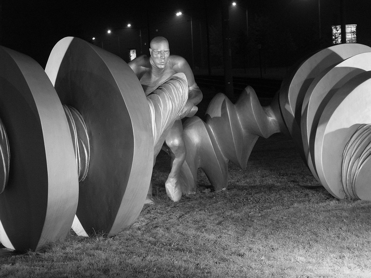 Im Zentrum dieses technisch anmutenden Arrangements hockt fest eingeschlossen und mit nach vorn gebeugtem Oberkörper eine Figur. Diese Figur trägt eindeutig männliche Merkmale und scheint mit größter Konzentration eine riesige Kurbelwelle anzutreiben. Eine kleine Handbewegung erzeugt eine große Wirkung und bisweilen wirkt es, als wenn die von ihm angetriebenen Massen überhandnehmen, denn links und rechts bauen die zwei Enden der Kurbelwelle ein mächtiges Energiepotenzial auf. Mehrere große Scheiben tragend, verdreht und staucht sich die Welle ins Unendliche. Ihre ständig sich wiederholenden Windungen und Drehmomente, zwischen denen der Mann eingebunden ist, illustrieren das moderne menschliche Getriebensein von den beschleunigenden Kräften unserer Zeit – der Takt der Zeit bestimmt die Unendlichkeit dieser Handlung in einer technisierten Welt und jeden Moment erwartet man ein Zurückschnellen der aufgestauten Bewegungsenergie. Damit verbinden sich nicht nur Ruhe und Dynamik, sondern auch das Physische und das Metaphysische vereinen sich zu einer gemeinsamen Form. Nach Vorn wird von der Energie der Natur und der Triebkraft des Menschen angetrieben und schlägt eine Brücke zum nicht abreißenden Strom des Straßenverkehrs an dieser Kreuzung - es kommt zu einer Synergie von Natur und Kultur.